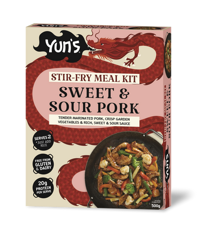 Marinated pork strips with a mix of colourful vegetables and a sachet of sweet and sour sauce.